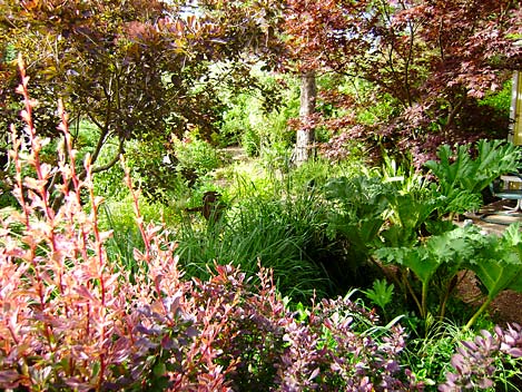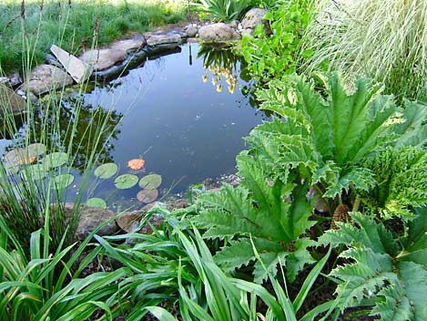 Gunnera tinctora (dinosaur food) is a favorite plant for use near water.