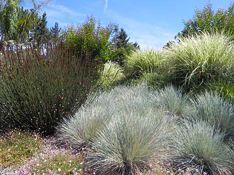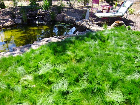 Environmentally friendly “no mow” meadows of seeded festuca rubra (creeping red fescue) are an excellent lawn substitute. They use less water and fertilizer than a conventional lawn, all the while (unlike most groundcovers) tolerating considerable foot traffic. Another benefit to a naturalistic grassy meadow is that since there is no mowing needed, furniture or art can be left in place directly upon the grass.