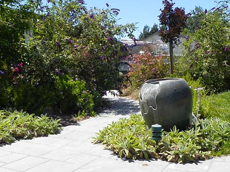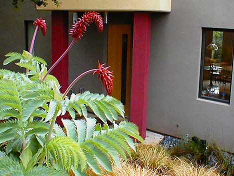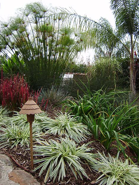 Yes, you can do "tropical" in Sonoma county, with careful plant selection. Accents like these custom light fixtures help enhance the theme.