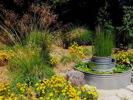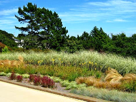 Mass plantings of ornamental grasses in a breezy location provide movement, impact and drama.