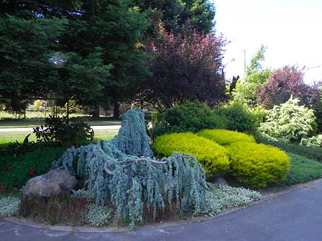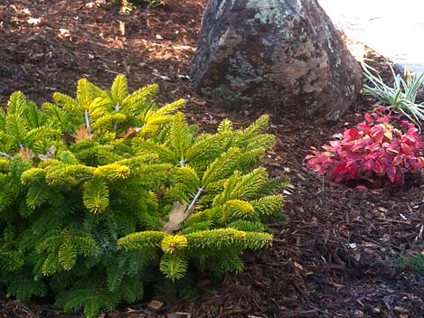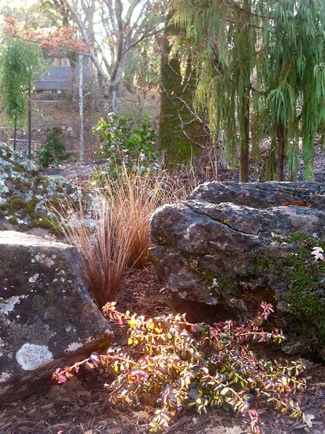 A weeping conifer (Cupressus cashmiriana) partnered with a 6’ long boulder.