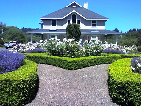 While formal gardens don’t work for many homes, there are instances in which they can be stunning. This house (neo-Victorian), setting (country estate), and site (circular driveway) all lend themselves well to a formal approach.